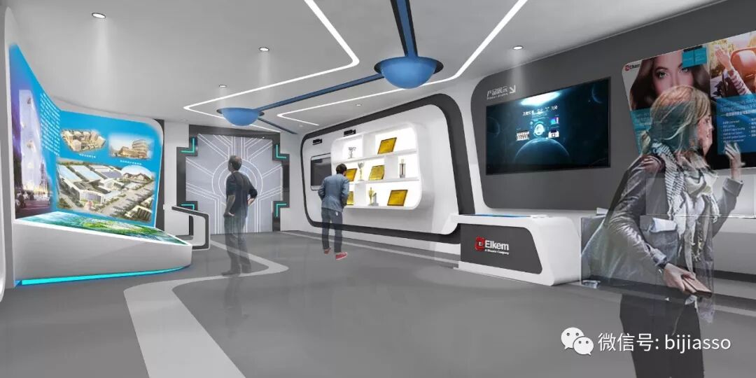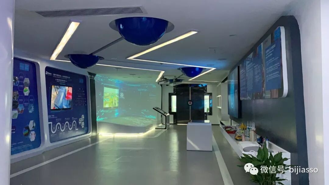 而在第四单元格使用显示屏与实物的结合、图中为展板,展示其企业荣誉:江西省智能制造试点示范企业、防爆手机智能巡检工厂、资质荣誉、领导关怀等。毕加以展示营销为主题,实现展厅现代化与智能展示高度融合,突显其星火文化内涵以及公司实力见证。