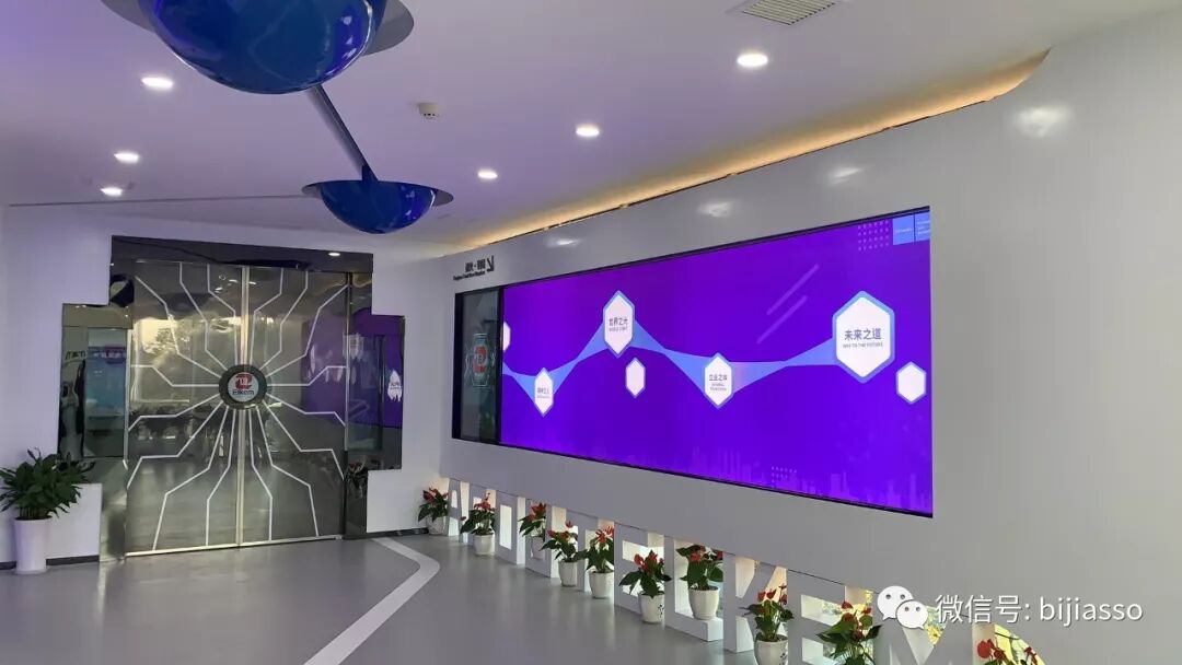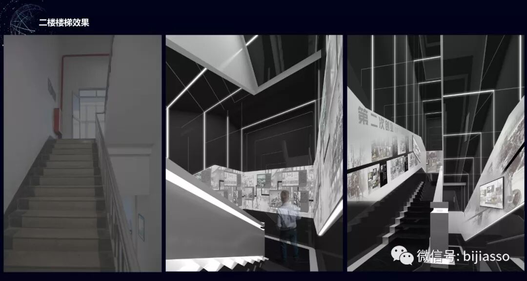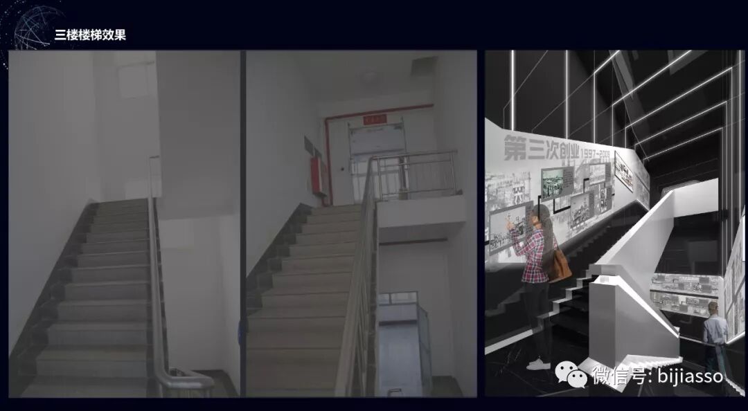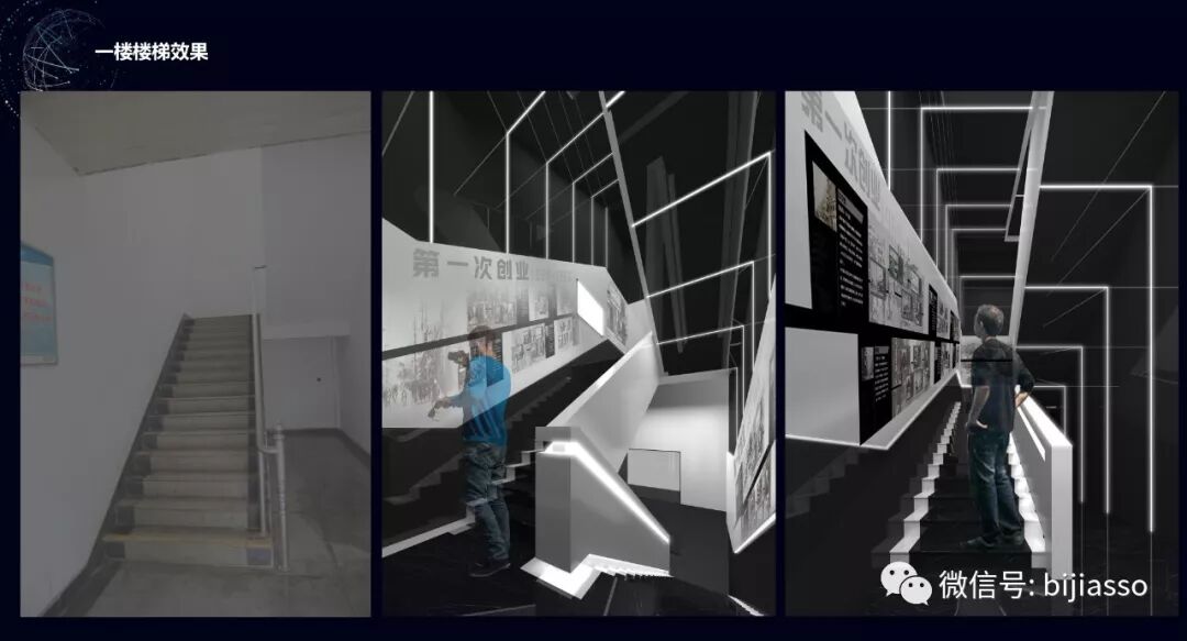 在第一楼到三楼楼梯上毕加使用10厘黑玻作底,玻璃拼接处嵌入灯条结合图为展板+显示屏展示星火第一、二、三次创业阶段,作为历史长河的历史见证,从开始星火的开始了解,每个阶段发展的事件,如何经历艰难岁月,结合企业文化展示。