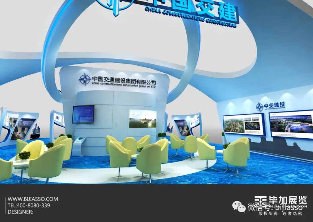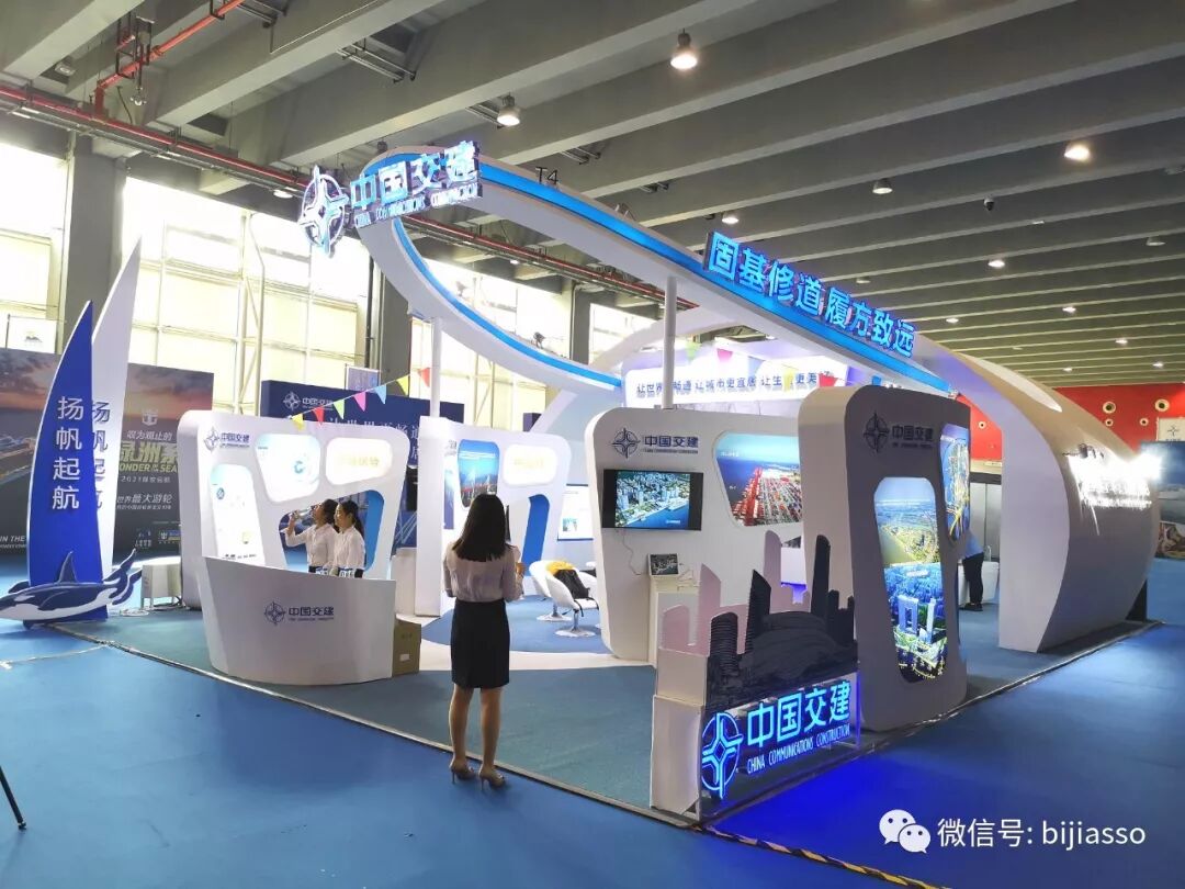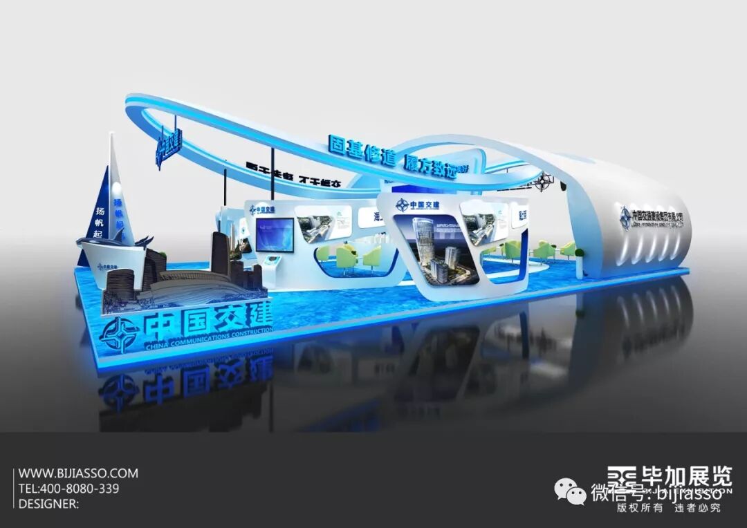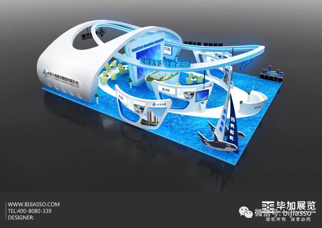 毕加总部市场部刘初生刘总合作中交城市投资控股有限公司(下文“中交”),为中交打造最具品牌特征的展示型展台,展台头部用弧形作轮船的形象,寓意一帆风顺,企业的未来前景,以蓝色作为主体色调,形作蔚蓝海洋中的不断前行的帆船。